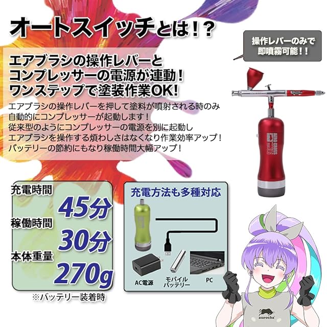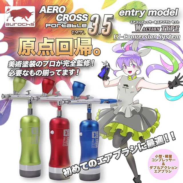 プロ完全監修のハンディーエアブラシ セットの入門機! aurochs (オーロックス)ハンディーコンプレッサー&エアブラシ セットはテーマパークや映画、TV等の美術特殊塗装を手がける現役アートペインターの責任監修。実際に使う人が考えたアイディアが詰まっています! 革命的機構搭載!! オートスイッチ機能は物理スイッチから圧感知型にバージョンアップ!!エアブラシの操作レバーとコンプレッサーの電源が連動、塗装時のみ電源が自動起動。 軽く堅牢なアルミボディでさらに軽く、内部構造を改良し壊れにくい設計に、 正統進化を遂げた充電式コンプレッサーが多彩な塗装を実現するEZ-Conversion System対応のダブルアクションタイプエアブラシを搭載! さらに洗練された圧倒的パフォーマンスを体感してください!!