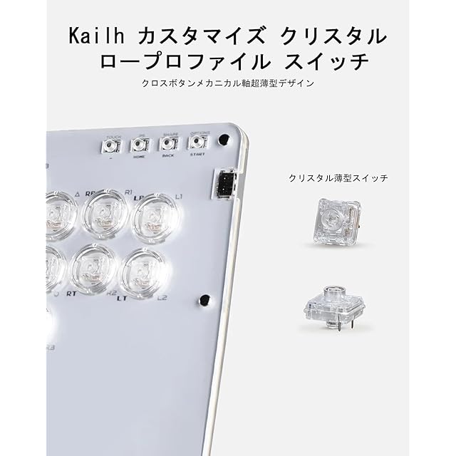 「クリスタル ロープロファイル キースイッチ」 ホットスワップ対応で、弊店のレバーレスアケコンの本体への取り外しが不要、易くスイッチを交換してカスタマイズ可能なので、スイッチの摩耗を気にしなくてもいい、押す体感で35g程度、指の疲れもなく、様々な打鍵感を体験できます。