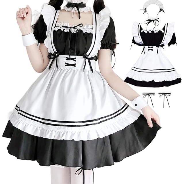 [GEAHOL] メイド服 コスプレ コンカフェ メイド エプロン 定番 ショート丈 10点セット メイドコスチューム 仮装 レディース メンズ セット 一式 こすぷれ イベント パーティー 大人 男女兼用 (M)