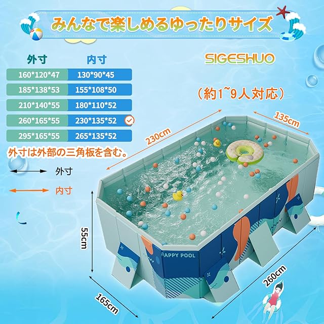 商品名:SIGESHUO プール 大型 家庭プール 空気入れ不要 折り畳み式 大型プール 深い 四角い プール大きめ 折り畳みプール 巨大プール 大型プール 大きいプール 子供用プール 特大プール 収納便利 子供 大人 水遊び 家庭用 大人用 自宅用 庭 ベランダ 室内 砂場 庭 猛暑対策 (260*165*55, E)