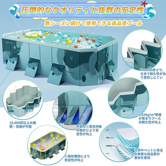 【群抜き耐久性】SIGESHUO プールの材料の厚さは7 mmに達し、空気入りプールの厚さの2倍以上です。極厚設計により、プールの耐久性と耐圧性が向上し、日常的な磨耗や摩擦に耐えるだけでなく、使用中の強い水の衝撃を効果的に防ぐことができます。 厚い素材と優れた耐久性により、プールは何シーズンも使用することができます。