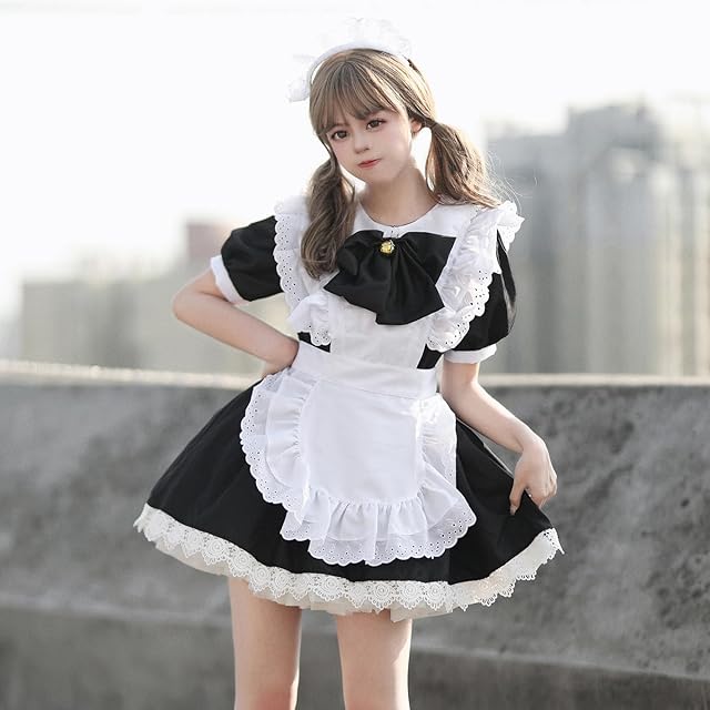 [MEYOIJK] メイド服 コスプレ 萌え コンカフェ メイド 定番 ショート丈 可愛い レース メイドコスチューム 5点セット ロリータ ワンピース レディース メンズ 大きいサイズ 仮装 ハロウィン 女装 人気 学園祭 撮影 (ブラック, 3XL)