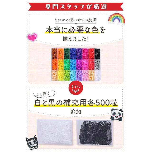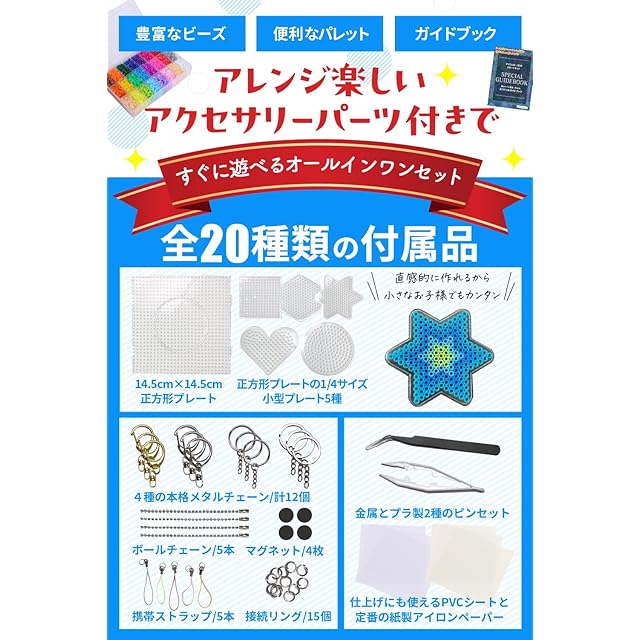 【付属品一覧】全24色アイロンビーズ各色約170粒、白黒補充用ビーズ各500粒、全6種アイロンプレート、全8種厳選アクセサリーパーツ、2種のピンセット、2種のアイロンペーパー、スペシャルガイドブック、取扱説明書、書カード