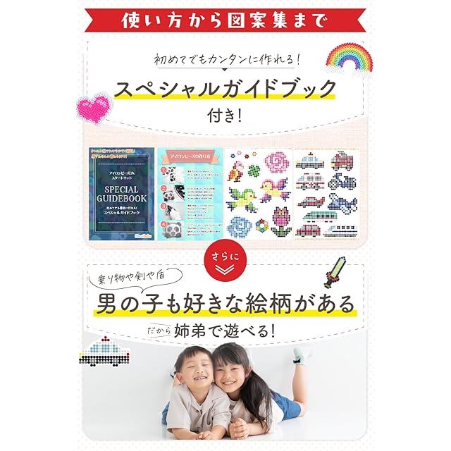 【オリジナルガイドブック付属!】初めてでも安心のフルカラー全22ページのガイドブック付属。アイロンビーズの基礎知識、画像付き8つの工程で作り方解説。また、重ねるだけで作れる100以上の原寸図案も紹介!