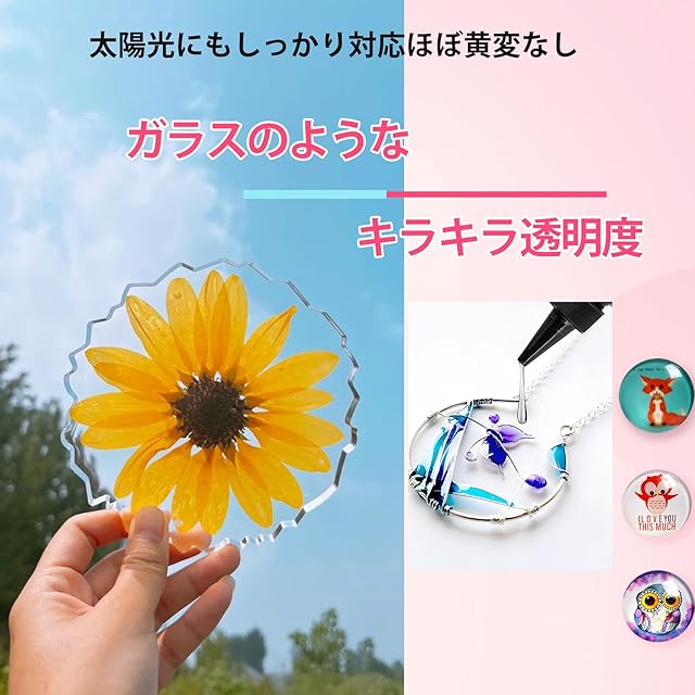 【驚異の透明度・発色抜群】Ymikoレジンは、透明度が高いので着色もしやすく、高い透明度によりお花や封入物が美しく綺麗に映えます。小さなアクセサリーから小物やインテリアなど、作れる作品の可能性は無限大です!