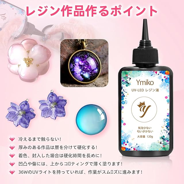 【高品質・大容量と低刺激性】Ymikoレジン液 大容量 激安500gとたっぷりお使いいただけます。扱いやすい100g、500gまで豊富なサイズ展開で、初心者からたくさん作りたい方まで用途やシーンに合わせてお選びください。収縮率が低くてヨレなくアクセサリーを作れます。仕上がりの透明度の高さとベタつきのなさが魅力のUVレジン液です。
