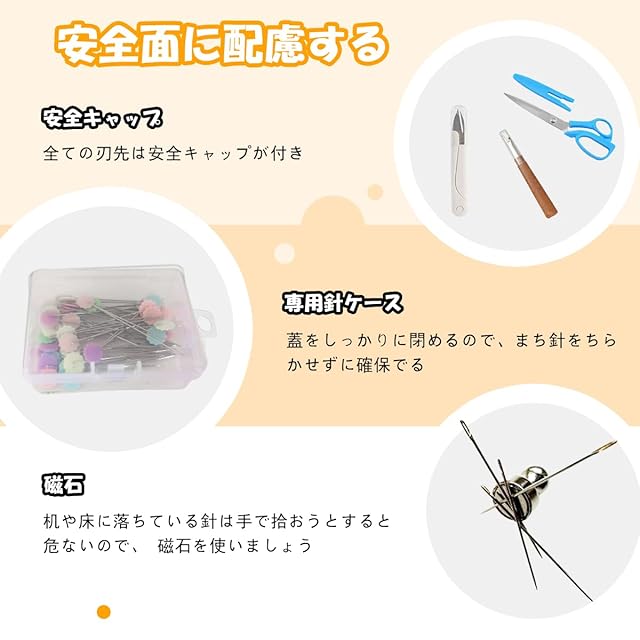 ✂【安全道具】ケガの防止に配慮するために安全キャップ、専用針ケース及び磁力ピンを用意しています。