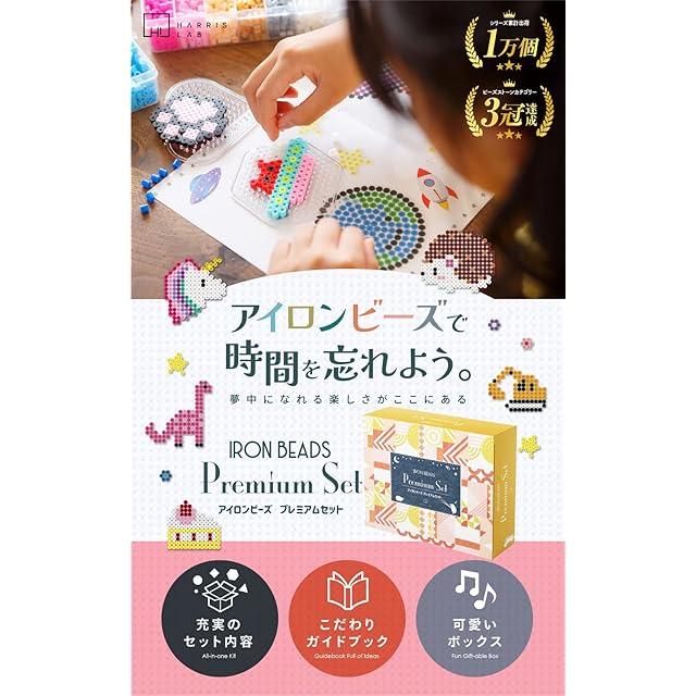 商品名:[ハリスラボ] アイロンビーズ セット 5mm 『プレミアムセット』 54色 図案100種類 約13000粒 夜光ビーズ 白 黒 Mix 補充付き ビーズアイロン シート プレート ピンセット