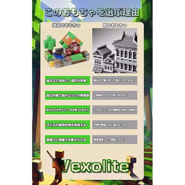 商品名:Vexolite マグネットブロック マイクラ風 磁石ブロック 立体パズル 知育玩具 マグネットパズル 小学生 おもちゃ 誕生日 入園 卒園 ギフト クリスマスプレゼント 2.3cm (66PCS 鉱脈)