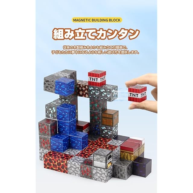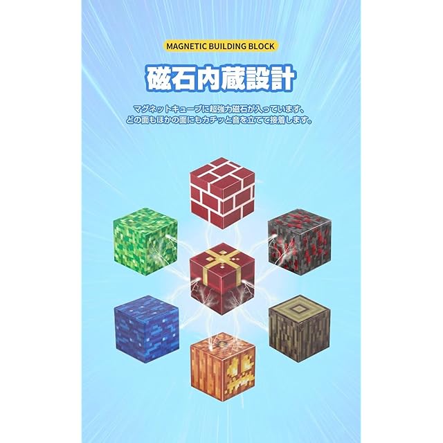 【磁石内蔵設計】このブロックセットは遊び時間を魔法のような創造的な冒険に変えます。マグネットキューブに超強力磁石が入っています、どの面もほかの面にもカチッと音を立てて接着します。従来の木製積み木よりも組み立てが簡単で、子どもたちに夢中になるような新しい遊び方を提供します。ブロックを思いのままに組み合わせて、ゲームでおなじみの場面を再現できる新しい遊びの形です。