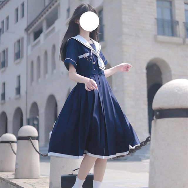 GSYCL セーラー服 ワンピース 半袖 紺色 ホワイト 女子高生 3点セット ハロウィン 衣装 JK 制服 コスチューム ロングスカート ネクタイ ベルト ボタン 女子制服 写真 撮影 文化祭 学园歳 卒業式 可愛い 森ガール (L, ブルー)