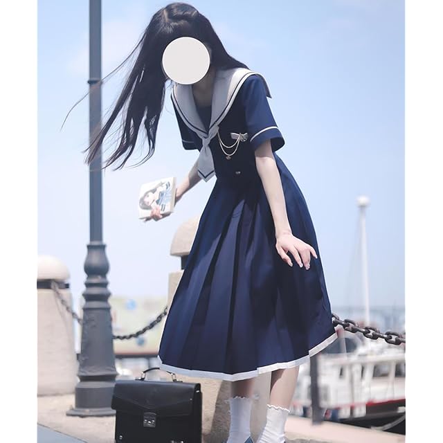 商品名:GSYCL セーラー服 ワンピース 半袖 紺色 ホワイト 女子高生 3点セット ハロウィン 衣装 JK 制服 コスチューム ロングスカート ネクタイ ベルト ボタン 女子制服 写真 撮影 文化祭 学园歳 卒業式 可愛い 森ガール (L, ブルー)