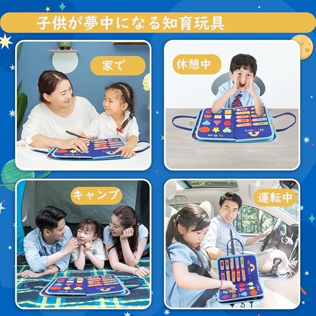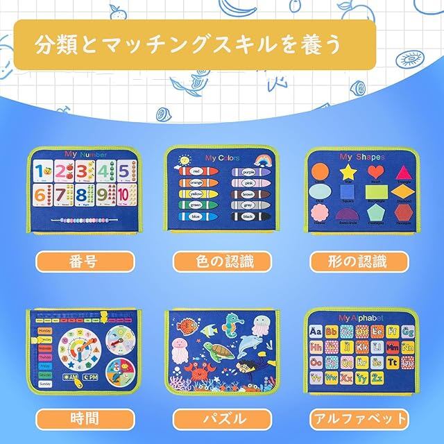 商品名:モンテッソーリ玩具 ビジーボード 紐通しおもちゃ 1歳 誕生日プレゼント 0歳 1歳 2歳 3歳 4歳 5歳 もんてっそーり 入園祝い 布絵本 ビジーブック お着替えの練習 知育玩具 指先鍛錬 発達玩具 五感発育 フェルトおもちゃ 女の子 男の子 クリスマス プレゼント 出産お祝い (ブルー)