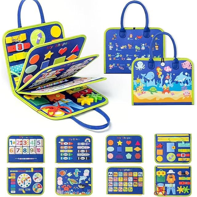 モンテッソーリ玩具 ビジーボード 紐通しおもちゃ 1歳 誕生日プレゼント 0歳 1歳 2歳 3歳 4歳 5歳 もんてっそーり 入園祝い 布絵本 ビジーブック お着替えの練習 知育玩具 指先鍛錬 発達玩具 五感発育 フェルトおもちゃ 女の子 男の子 クリスマス プレゼント 出産お祝い (ブルー)