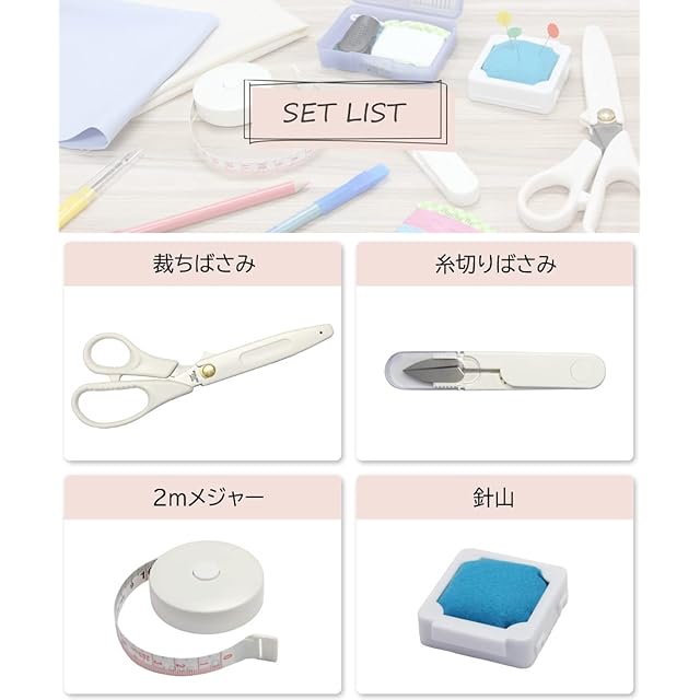 ・裁縫バッグ ・針セット(ミシン針 1本 マチ針 10本 なが針 2本 中針 1本 ししゅう針 1本 みじか針 2本 名前シール 1枚 指ぬき 2種 糸通し 1個 指通し 1個 手縫い糸 白 25m 手縫い糸 赤・黒・ピンク・ブルー 約12.5m) ・針山 ・リッパー ・メジャー2m ・日本製21cm裁ちばさみ ・糸切りばさみ ・チャコペンシルピンク・ブルー