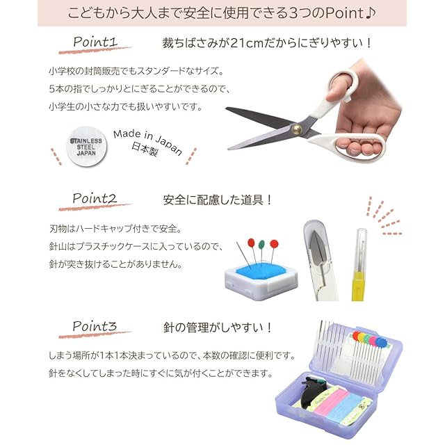 キャップ付の糸きりばさみ、プラスチックケース入りの針山など安全面を考慮しております。