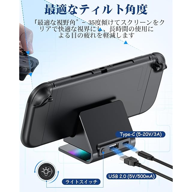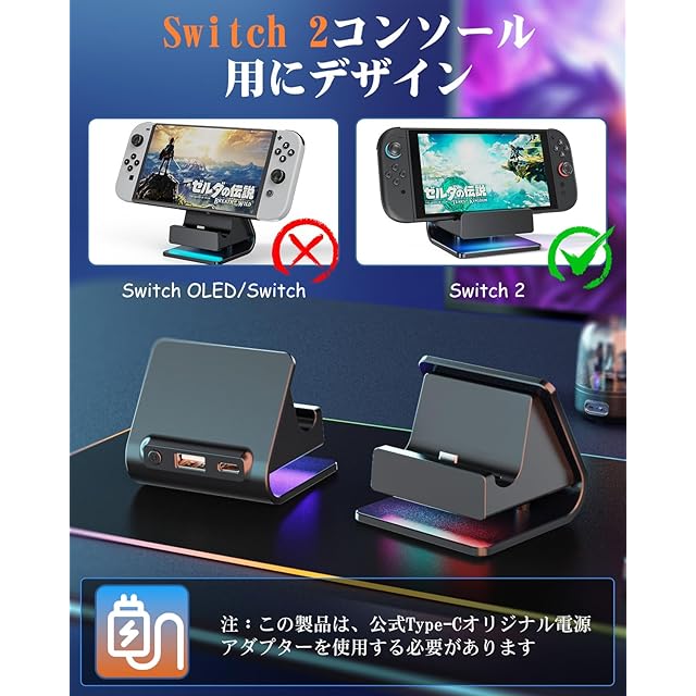 対応Nintenndo Switch 2用応充電スタンド、スイッチ2 用ポータブルドックスタンド、NS 2 本体用ドック、「マルチモード照明・スマートチップ内蔵・最適な傾斜角度」