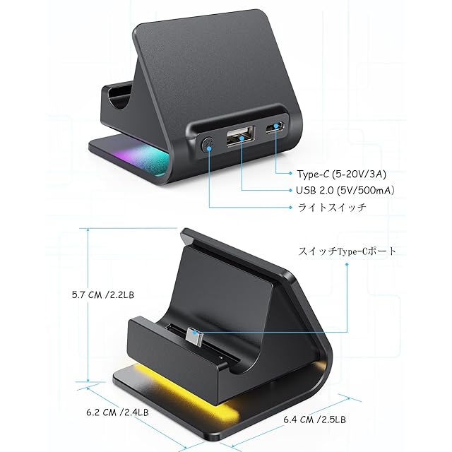 【スイッチ2本体のPD急速充電】:ミニドックには3つのポートがあります。Type-C(5-20V/3A)電源ジャック:PD急速充電.有線コントローラーやその他の周辺機器を接続して使用するためのUSB 2.0(5V/500mA).ライトの色を変えたり、ライトのオン・オフを切り替えたりできるライトスイッチで、ゲームをしながら高画質で楽しめます。 視覚効果。