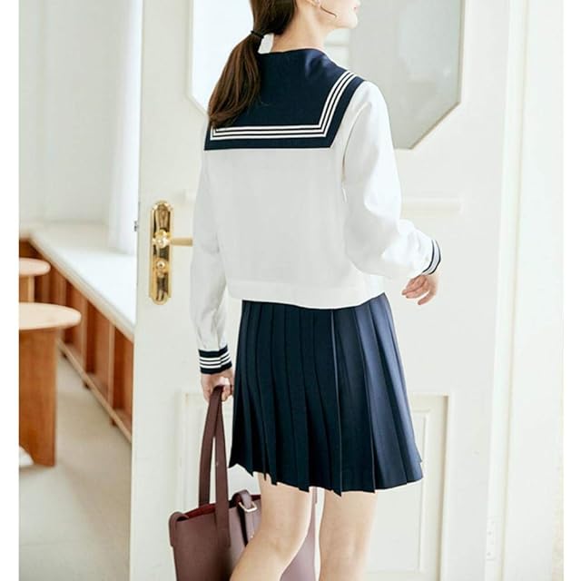 Aculldo セーラー服 白 半袖 長袖 シャツ スカート 蝶結び 3点セット 白三本 関西襟 前開き 可愛い コスプレ コスチューム JK制服 学生制服 高校生 学生制服 仮装 学園祭 文化祭 本格制服 (長袖セット,L)
