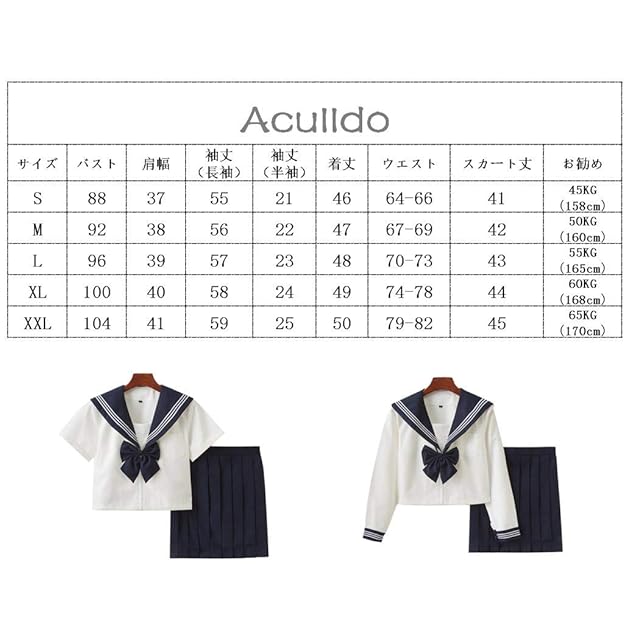【素材】ポリエステル、綿;<br> ポリエステル&綿というものは、ソフトと耐用性ある素材です。<br> セーラー服はポリエステル&綿を作らて、しっかりしております。<br> ドレープ感があり、着用で不収縮です。<br> 【セット内容】3点セット:シャツ+スカート+蝶結び;<br> 半袖や長袖があります~春から冬まで着用できます~<br> スッキリとまとまった清楚な感じのセーラー服です。<br> 【特色】生地はもちろん、更に丁寧な縫製を持って、<br> 見えない細かな部分にまでこだわりの仕上がりです。<br> 関西襟のデザインで、女子高校生らしさ抜群~トップスはジッパー仕様で、着脱しやすいです。<br> 【お勧め】無地のプリーツ:ふわ〜り感で履くだけでスラリとした美脚に魅せます。<br> 歩くたびにふわっと揺れるプリーツスカートは女の子らしさたっぷり。女子力up!<br>さらにウェストのサイズを調節できます。<br> 【シーン】コスプレ、仮装パーティーや普段着の場合でも似合いますよ。<br> 【付き】<br> Aculldoはいつもお客様に心地良いショピング体験を提供するために努力しています。<br> きっと満足できる商品を提供します。もし困ることありましたら、<br> ご遠慮なく直接に連絡ください。<br>