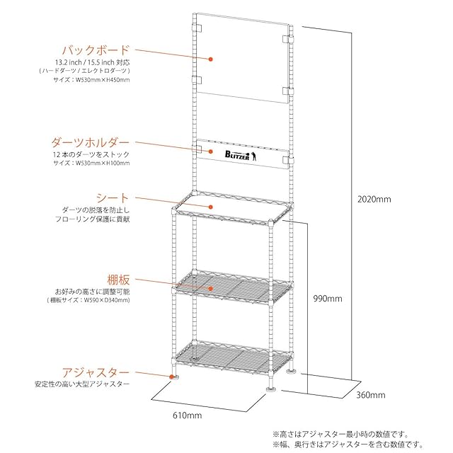 商品名:BLITZER(ブリッツァー) ダーツスタンド BSD21-NA 自立式 簡単組立 スチールラック方式採用 【本体サイズ: 約 202 x 61 x 36 cm】 ダーツホルダー付属 安定性のある大型アジャスター(足)採用 インテリアの雰囲気を邪魔しないナチュラル色(NA)採用 本格的ダーツボードスタンド