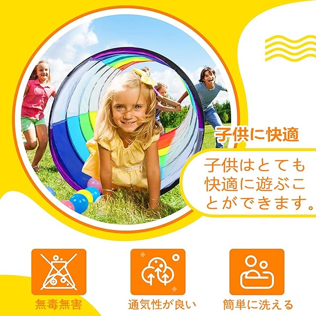【安心の品質】子どもトンネルは丈夫なポリエステル素材を採用して、無毒、無臭 、洗いやすい、風通しが良い、耐久性に優れるなどのメリットがあります。可視のメッシュ素材を採用して、通気性抜群だけでなく、遊んでいるお子さんの様子がいつでも見えるので安心です。男の子と女の子も安心して使います。