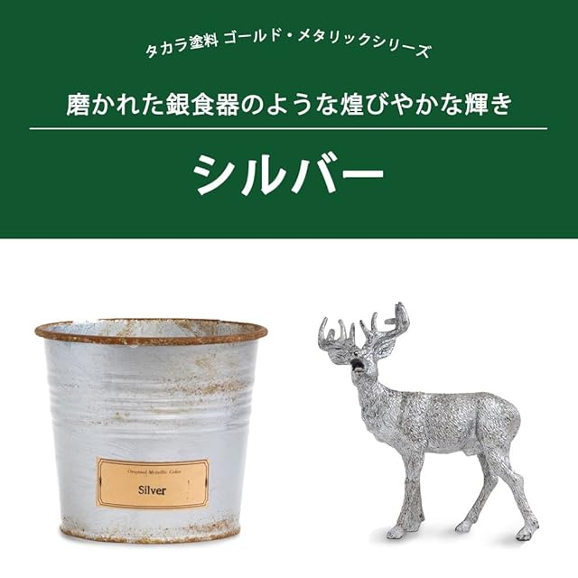 TAKARATORYO(株式会社タカラ塗料)のオリジナルペイント『ゴールドメタリックシリーズ』です。<br>光り輝くパールをふんだんに配合した水性塗料。<br>本物の金属とは違い、錆びることなく輝きが長時間持続するので、 インテリア小物や家具のポイント塗装、看板やサインアートなど幅広くご使用いただけます。<br><br>Silver/シルバー:磨かれた銀食器のような煌びやかな輝き。