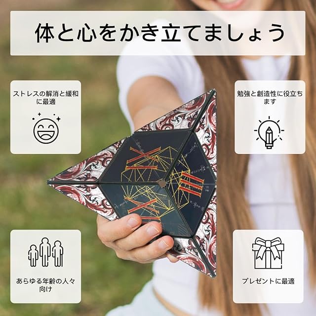 変形するプレゼント – 当社の知覚マグネットキューブは、あらゆる年齢の方への感覚刺激パズルやSTEM (科学・技術・工学・数学) 教育用おもちゃとして、素敵なプレゼントとなります。 心地良いクリック感のあるシェイプシフトパズルボックスは、心休まる癒し効果でストレスやイライラを緩和します。 つなげて大きな作品を作れる4個セットのギフトボックスをお試しください。究極の知覚おもちゃのセットを大好きな人にプレゼントしましょう。
