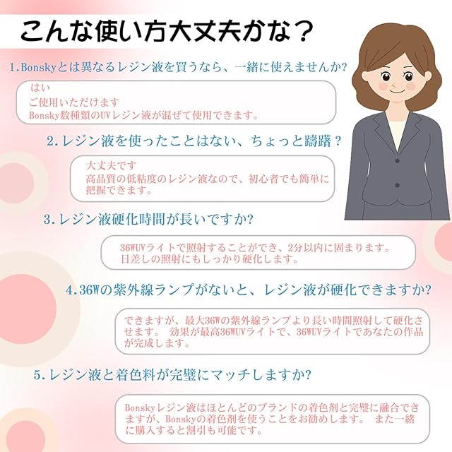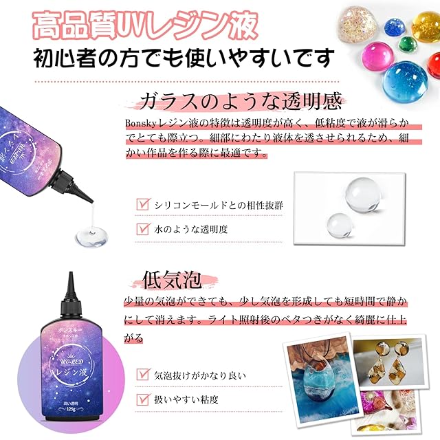 Bonskyは10年以上のレジン液の製造経験を持っています。高光沢のレシピにより、完全に透き通った装飾面を硬化させ、磐石のように硬くし、傷や黄ばみに耐えることができます。揮発性有機化合物は全くありません。BPAを含まず、燃えにくいです。お客様は安心してお使いいただけます!<br/><br/> <b>透明感:</b>着色剤や小物パーツとの相性も良く、とてもきれいです!不純物がほとんど見えません!<br/><br/> <b>変色しにくく黄色くなりにくいです:</b>他のレジン液より、Bonskyレジン液は長持ちし、黄色くなりにくいです。注:長年の劣化や使用環境などにより、樹脂特有の変色があります。<br/><br/> <b>硬化に要する時間が短い:</b>UV-LEDで硬化できます。時間は最大30秒(使用ランプのワット数と電力による)です。太陽光が照射されても、硬化することができます。経験者も初心者も簡単に操作できます。制作プロセスをより楽にして安心させます。<br/><br/> <b>操作手順:</b><br/>1.キャップをひねって、封口(専用の封口で、漏れ防止のため)を開けます2.計量カップに注ぐぎます。お客様の好みの色やアクセサリーを加えて、均一にかき混ぜることができます。3.型に流し込みます。36WのUVランプや日光で2~4分で硬化します。<br/><br/> <b>次の点にご注意ください:</b><br/> 1.換気環境下で操作を行うべきです。<br/>2.使用後、キャップを密封し、日陰に置いて日光が当たらないようにしてください。<br/>3.子供の手の届かないところに置いてください。不注意で肌に付着した場合は、すぐに洗い流してください。