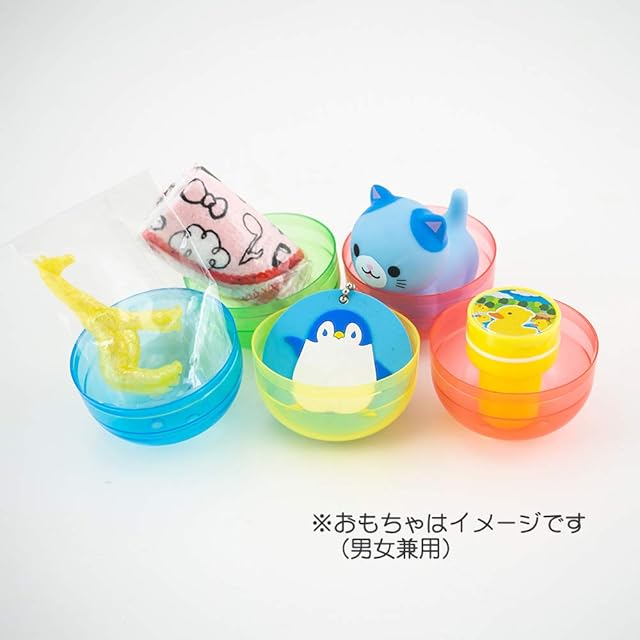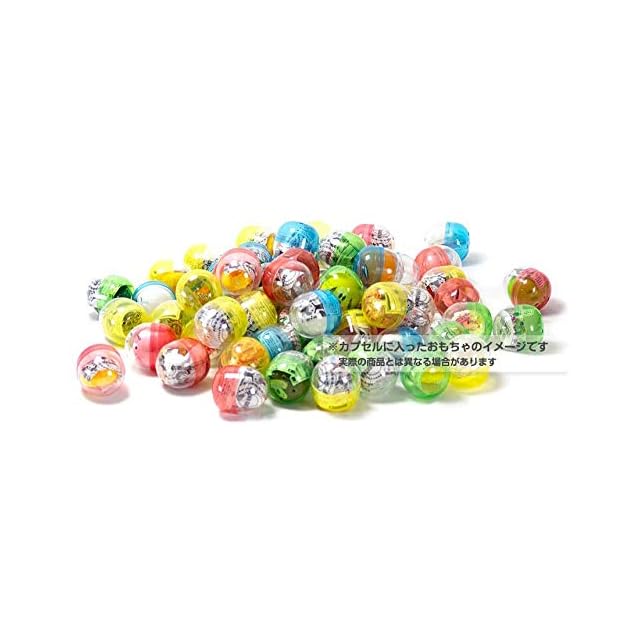 男女兼用向けのノンキャラクター商品や、おもちゃの詰め合わせセット(100個分)です。 48mmのアソートカラーカプセル(半分透明、半透明赤・青・黄色・緑)におもちゃがそれぞれセットされて入っています。