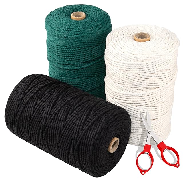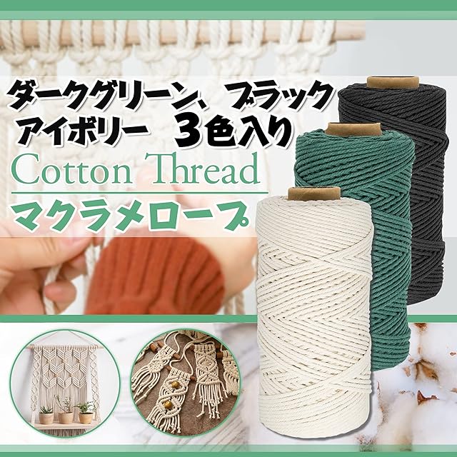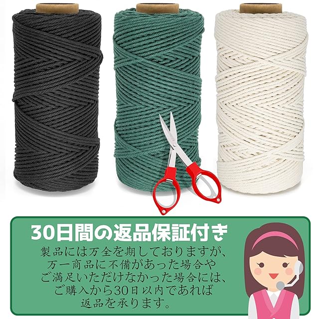 【サイズと包装】1巻き当たり長さ約220ヤード(200 M)、直径3 mmのマクラメ糸、 ダークグリーン、ブラック、アイボリー、1本のはさみがついていて切断して使いやすいです。これは4本の撚り100%綿糸です。手芸プログラムには、マクラメ糸は厚くて頑丈です。