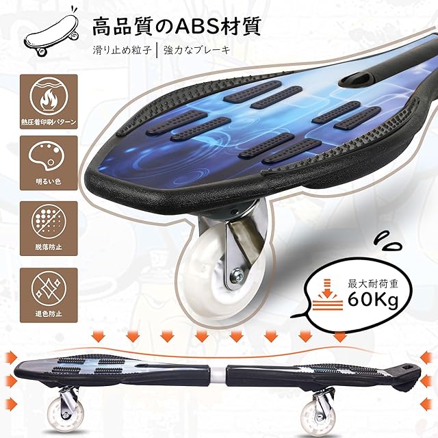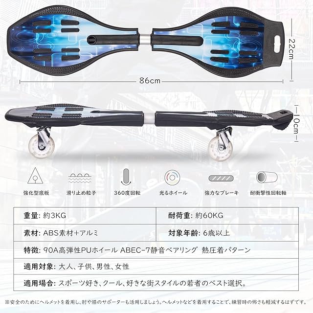 サイズ:86*22*10CM 重量:約3KG 耐荷重:約60KG 6歳以上の子供、10代の若者、および大人に適しています。様々な道路状況に対応。軽量、衝突に強い、衝撃に抵抗するブレイブボードです。*手動測定のため、小さな誤差がある場合があります。