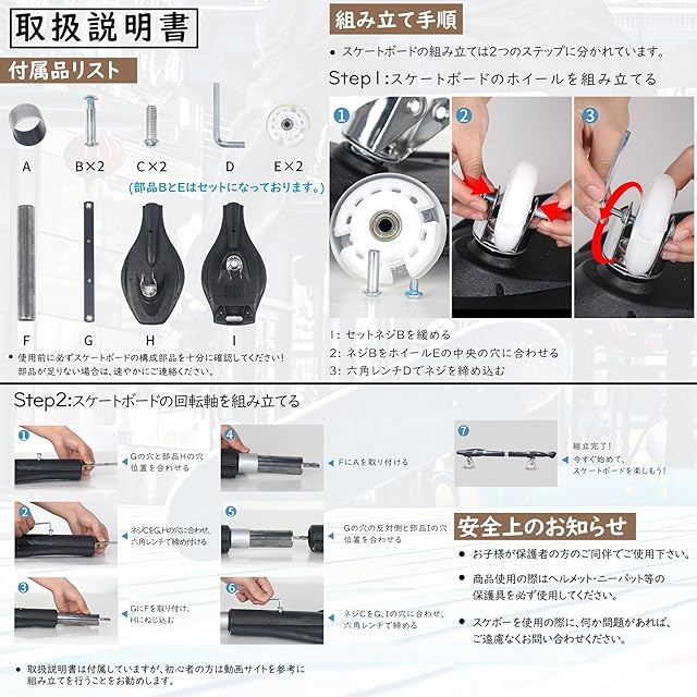 【注意事項】使用前に必ずスケボーの構成部品を十分に確認してください!パーツが足りない場合は、速やかにご連絡ください。交換パーツをさせていただきます!小さなお子様はヘルメット&ひじ・ひざパッドを必ず装着し、保護者の方と一緒にご使用ください。輸入品の為、多少の傷や汚れがある場合がございます。ディスプレイ画面等の環境上、写真と実際の商品の色とは多少違う場合がございます。