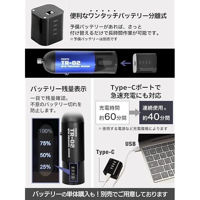 ■使いやすさを極めたコンプレッサー 残量が分かる交換式バッテリーを採用。突然のバッテリー切れの心配をせずに作業が出来ます。また圧力感知式スイッチを搭載している為、ホースでの接続時にもオートスイッチが作動いたします。 接続部は最も一般的な1/8インチサイズに対応。様々なツールを接続できます。
