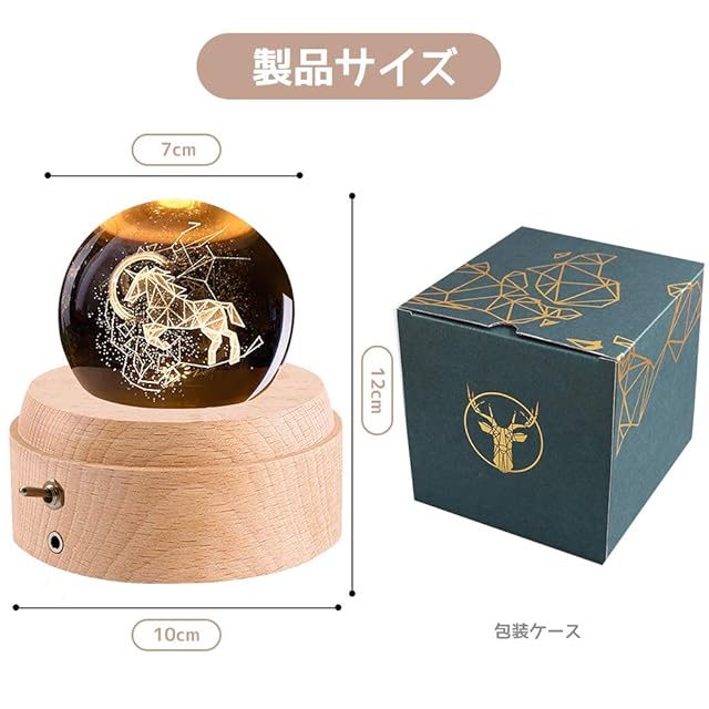 オルゴールはK9クリスタルで作られています。透明で美しい上質なクリスタルボールの内部に、レーザー光線により三次元の「ユニコーン」画像を加工しております。芸術的な光と音の彫刻品!いつまでも、変わらぬ音とメロディーであなたの大切な思い出や自分時間をお守りします。曲目:ONE LOVE(嵐)。
