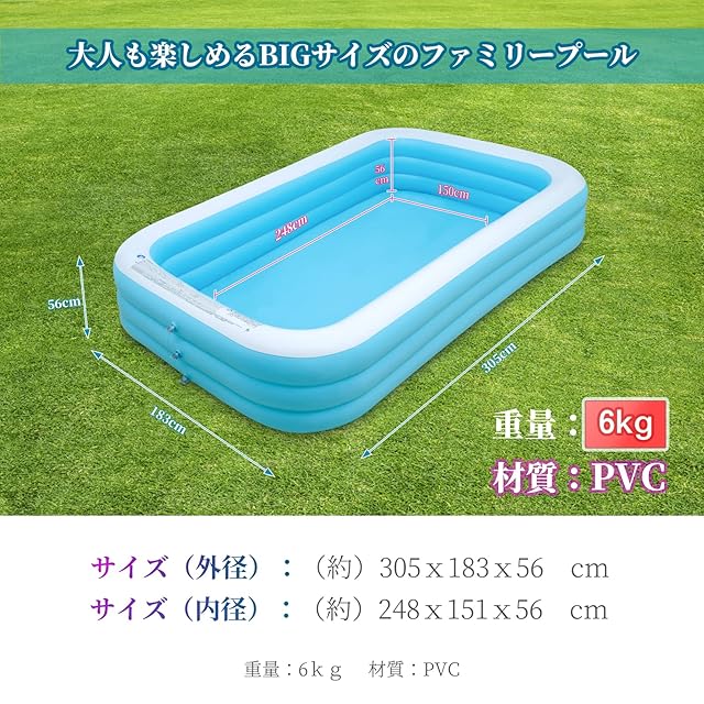 *305*183*56CMな大きいサイズの家庭用プールで、大人でも楽に使用できます。夏の暑い時期に家族と一緒に水遊ぶのは、親と子供の間の感情を促進することができて、夏の暑さを和らげ、気持ちを楽にすることができます。 *大型ビニールプールは三層構造で、3つ気室あります。段ごとに空気穴があり、空気の偏りが起きにくいので、安定感抜群! *2段式空気抜きバルブで、空気の逆流を防ぐ弁がついて、空気を注入・排出がとてもラクにします。 *安全無毒PVC材質を採用します。