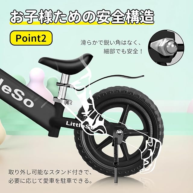 商品名:LittleSo ペダルなし自転車 3~8歳 キッズ 12インチ キックバイク スタンドあり 子供用 超軽量 持ち運びも簡単 おしゃれ 発泡タイヤ 乗り物 お祝いクリスマス 誕生日 プレゼント 子供 男の子 女の子 プレゼント 幼児 子どもの日 誕生日 (ブラック, 12インチ)
