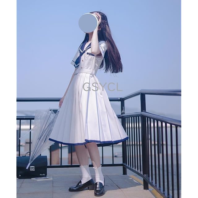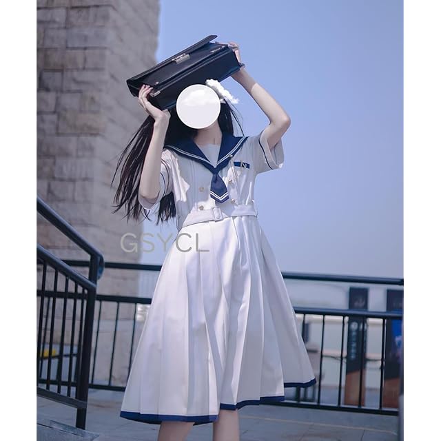 [GSYCL] セーラー服 ワンピース 半袖 紺色 ホワイト 女子高生 3点セット ハロウィン 衣装 JK 制服 コスチューム ロングスカート ネクタイ ベルト ボタン 女子制服 写真 撮影 文化祭 学园歳 卒業式 可愛い 森ガール (XL, ホワイト)