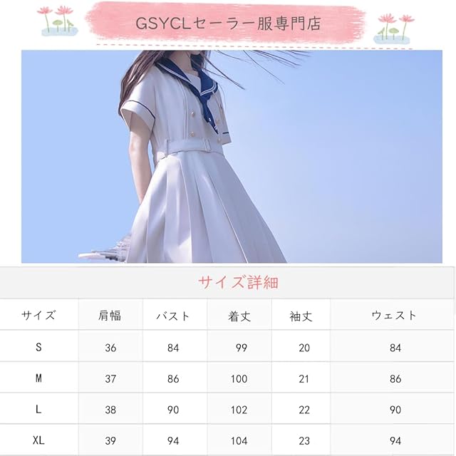商品名:[GSYCL] セーラー服 ワンピース 半袖 紺色 ホワイト 女子高生 3点セット ハロウィン 衣装 JK 制服 コスチューム ロングスカート ネクタイ ベルト ボタン 女子制服 写真 撮影 文化祭 学园歳 卒業式 可愛い 森ガール (XL, ホワイト)