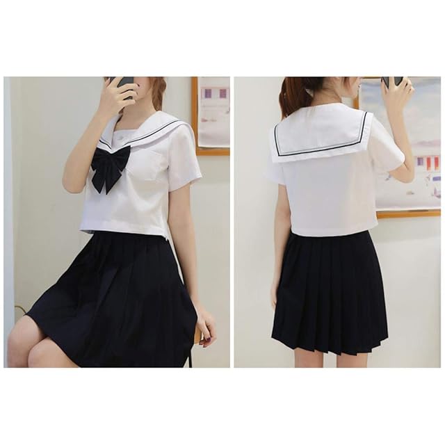 Aculldo セーラー服 半袖 長袖 女子制服 学生服 女子高校生 高校生 学生 制服 コスチューム 3点セット JK制服 二本 白い 可愛い コスプレ 仮装 本格制服 大きいサイズ (半袖セット,Xxl)