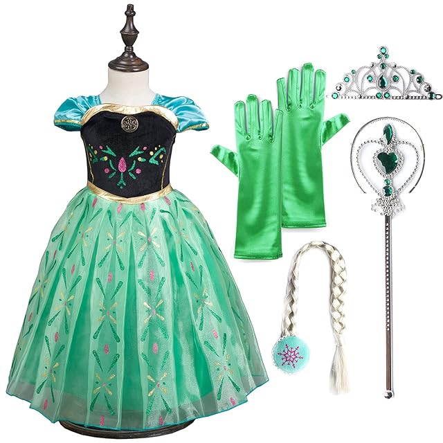 [YITING] 子供 用 プリンセス エルサ ドレス コスチューム アナ雪エルサ ドレス 豪華5点セット ・グリーン (プリンセスドレス, ハートのティアラ, 魔法のステッキ, 手袋, 三つ編みウィッグ)