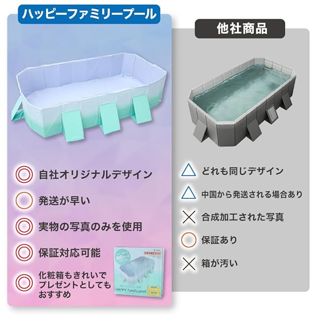 【 折りたたみプールとは 】折り畳みプールは数多く御座いますが、弊社の折りたたみプールはここが違います!1.「広げるだけで簡単に遊べる折りたたみプール」空気入れの必要がない折りたたみのプールなので、広げるだけで簡単に設置することが出来ます。 面倒な準備は必要ないので、水を入れてすぐにプールで遊べます!2.「折りたためるから収納に便利」折りたたみプールはコンパクトに折り畳むことができるので、収納場所に困りません。持ち運びにも便利なので、いろいろな場所で遊びましょう!3.「大型プールだからみんなで楽しく遊べる!」大型折りたたみプールは大きいので、みんなで遊ぶことができます。かわいいイルカやハートの柄なので写真でも映えます。プールは支え板付きで倒れにくい設計です。