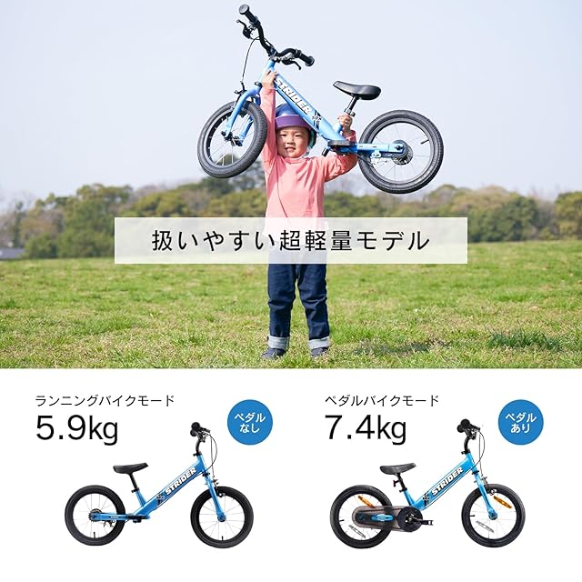 説明:14インチホイールと着脱式ペダルユニットを搭載したストライダー14xは軽量で取り回しがしやすく、お子さまのファーストペダルバイクに最適です。