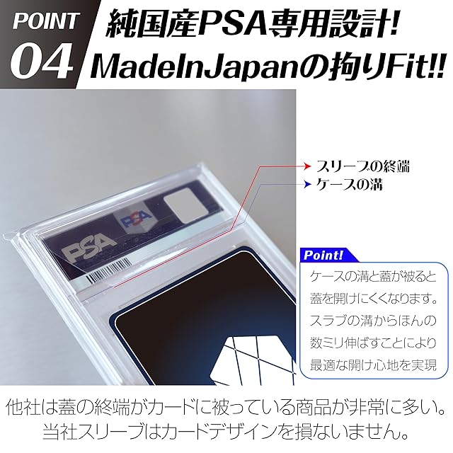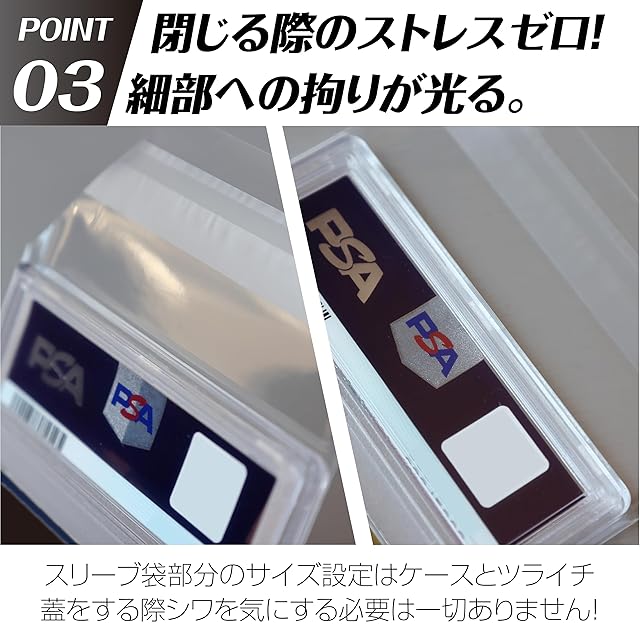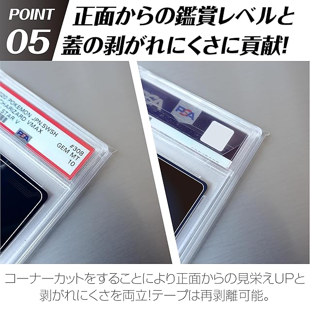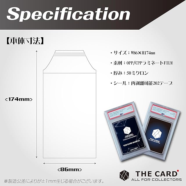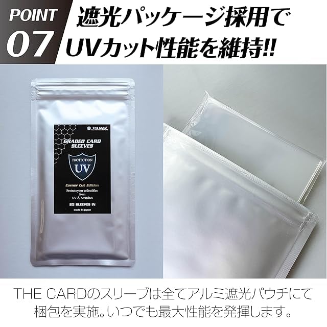 【PSA専用UVカットスリーブコーナーカットエディション】 国内最古参のMade In Japanに拘るPSA鑑定アクセサリ専門メーカーTHECARD。 大ヒットを誇るPSAスリーブは他社と一線を画すOPP/CPPのラミネート素材を採用。 独特の触り心地がコレクターの皆様から大好評を得ております。 最新の試験結果によるフィルムのUVカット率は非常に高いものとなっており、UV-A,UV-Bともに90%以上のカット率を叩き出しました。(商品画像参照)インクや紙の劣化を引き起こす波長帯のメインである320-360nmまでは従来のフィルムをさらに上回る結果となり、また320nm以下では100%に近い高いカット率となります。 THECARD史上最強のフィルムです。このようなカット率が高いフィルムは今までも存在しておりますが、透明度や色味に問題がありました。今回その点について研究を重ね、コレクターの皆様の需要に耐えうる透過率約90%のレベルまで引き上げ色味も黄ばんだようなことも無く白です。