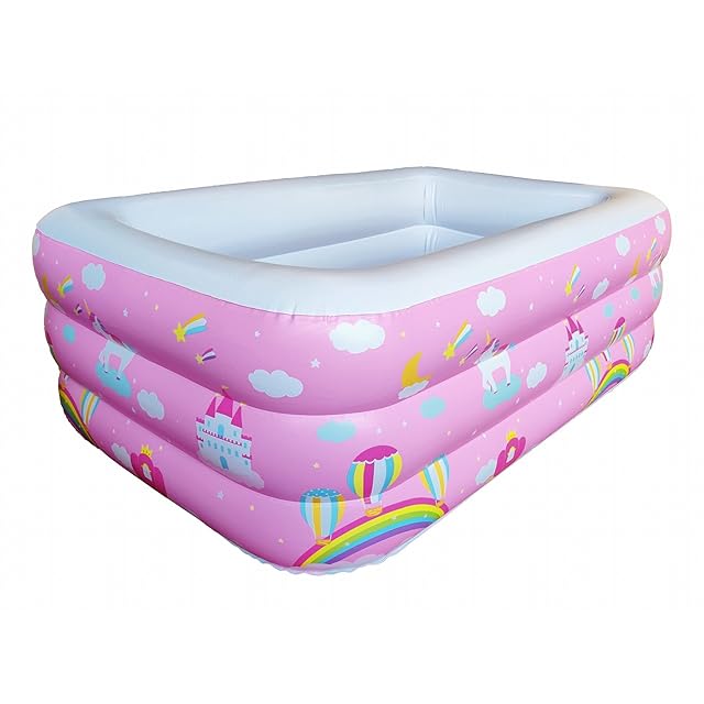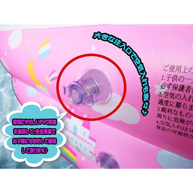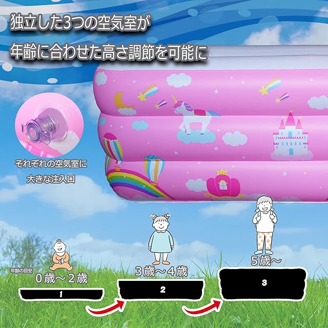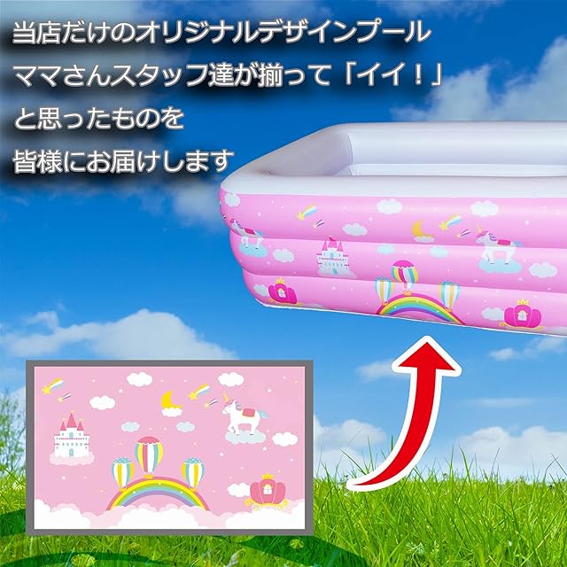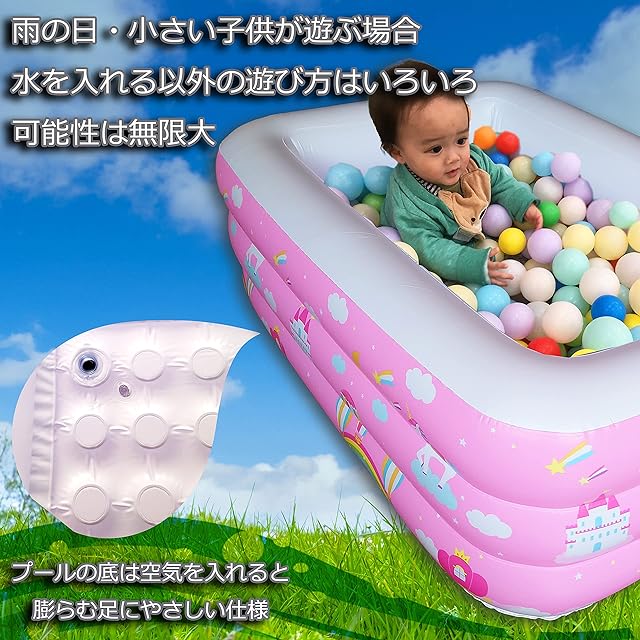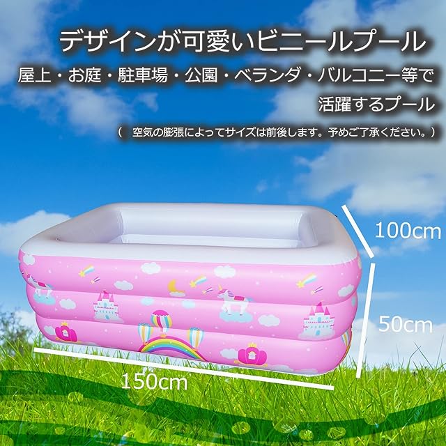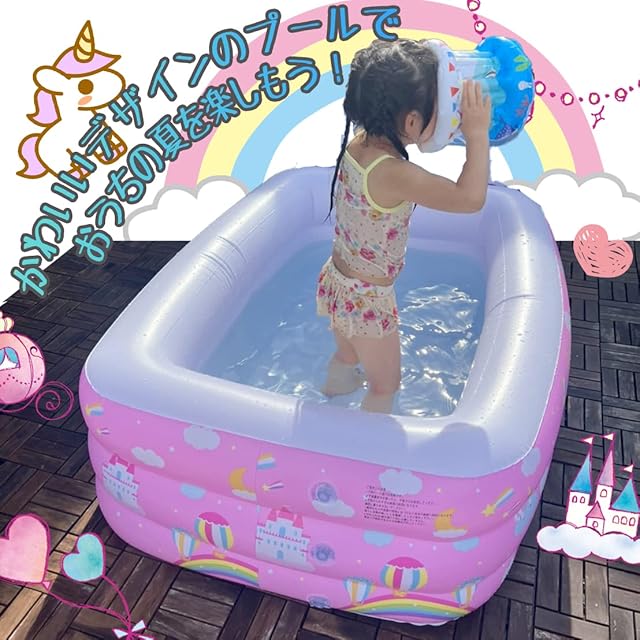 【水遊びを思いっきり楽しもう!】お家にいながら水遊び。外出を減らす必要がある時期または海やプールに行く暇がない時にも、 庭で家族や友達と一緒に遊ぶことができます。子どもたちのお出かけ欲求、冒険心や好奇心も、これで解決♪ 屋外でも室内でも使用可能で、工夫次第で1年中遊べます。 【キュートな7つのデザイン】ユニコーンやお城などをゆめかわいく描いたデザイン、恐竜たちが仲良く歩く姿をかわいく描いたデザイン、うさぎやねこなど、かわいい動物たちが仲良く楽しそうに遊んでいるデザイン、美味しそうなアイスをポップに散りばめたデザイン、クジラやイルカなど海のかわいい生き物たちを空に散りばめたデザインをご用意。水風船を浮かべたり、ボールやおもちゃなどを入れて、あなた独自の世界観を創りだし、プールタイムを満喫できます。 【サイズ・階層は2パターン】南の島:4層 150 x 100 x 65 cm 他デザイン:3層 150 x 100 x 50 cmの2パターンをご用意!お好きなデザインを、ご利用用途に応じてご選択ください♪ 【やわらかクッション三段タイプ】一層ずつ膨らませられるように、三段それぞれに空気入れがあって便利。商品の底部分には水抜き用の栓がついていて、排水もラクラク。 【安心安全】素材は人と環境に優しいPVC素材を使用しています。厚みもあるので破れにくく、底面がクッション性のため、子供たちが安全に水遊びに集中できます。 【安心のアフターサービス】30日間 返品・返金付き。開封時点で不備があった場合、未使用のものに限り、返品対応させていただきます。 ※一度でもご使用になられたものは対象外。 【注意事項】※お子様が使用される場合は安全のため必ず保護者の目の届く範囲でお使いください。※平らな場所でお使いください。 ※とがったものや鋭利なもので傷つけないようにご注意ください。※タバコ、火気類の近くでは使用しないでください。 ※長時間直射日光の強い場所に保管されますと商品が傷んだり変色しやすくなる原因となりますので、ご注意ください。※ご使用後は陰干しで乾かして、湿気の少ない場所に保管してください。※PVC製品なので、匂いが気になる場合は風通しのよい場所で換気してください。