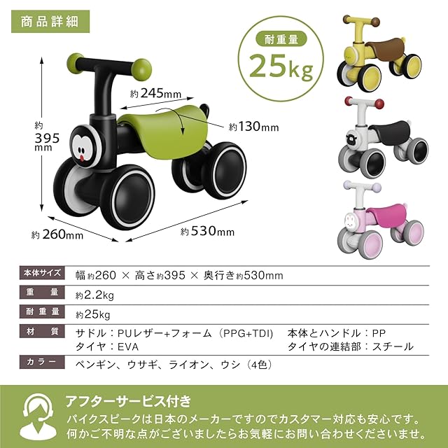 お子様が一人で遊ぶのは危険ですので、保護者同伴の上でご使用ください✅【仕様 / 内容】【仕様】サイズ:530×260×395mm、重量:2.2kg、最大積載量:25kg、適用年齢:1歳以上、椅子の高さ:約27㎝ 素材:サドル(PUレザー+フォーム)、タイヤ(EVA)、本体とハンドル(PP)、タイヤ連結部(スチール)【メーカー】PYKES PEAK製品の販売元は日本です。カスタマー対応も日本人スタッフが日本語で丁寧に対応いたします。初期不良や故障などの場合は、公式ライン「@pykespeak」もしくは、メール「[email protected]」までご気軽にご連絡ください。