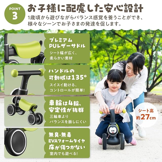 ✅【お子様に配慮した安心設計】プレミアムPUレザーの柔らかいサドルと広めのシートで、1歳のお子様でも快適に使用できます。車輪はフールクローズデザインで、安全性を確保。床を傷つけないタイヤ素材により、室内での使用も可能です。細部まで安全と快適さを追求した設計で、安心してお使いいただけます。
