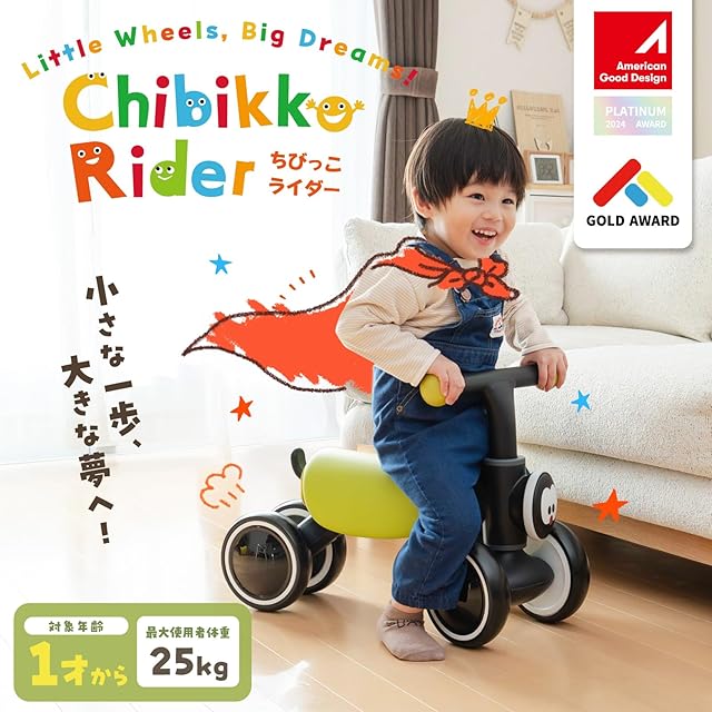 ✅【抜群の安定感で安心♪】「ちびっこライダー」は4輪構造で高い安定性を実現。三輪車よりもバランスを崩しにくく、安心して使用できます。タイヤはEVAフォーム製で無臭・無毒、床を傷つけない仕様のため、室内でも安心して遊べます。また、専用バランスボード(別売り)を使えばロッキングアニマルとしても楽しめ、15度の傾斜でバランス感覚を養う遊びが可能です。