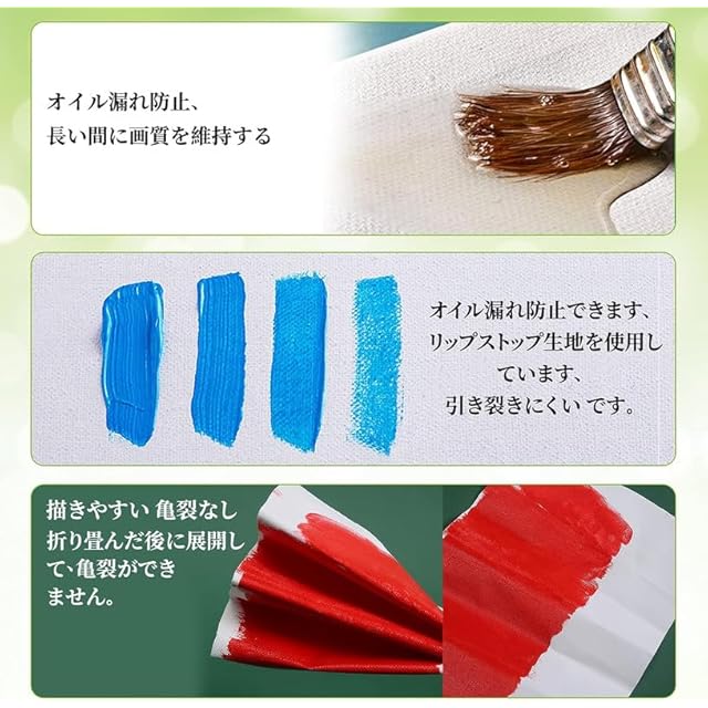 【描きやすい】:画布は綿化繊混紡の高品質素材を使って、中目のキャンバスです。麻に比べキャンバスの目が均一できれいです。色乗りがよく、描きやすいです。さまざまな絵具に対する吸収性にすぐれ、塗料が漏れにくいです。半吸収性の特性で、油絵だけでなく、アクリル絵の具にも使用できます。