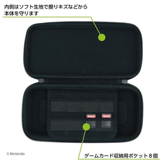 Nintendo Switch(有機ELモデル)本体・Nintendo Switch本体、またはNintendo Switch Lite本体のいずれか1台を収納することができます。Joy-Conを取り付けたまま収納できます。